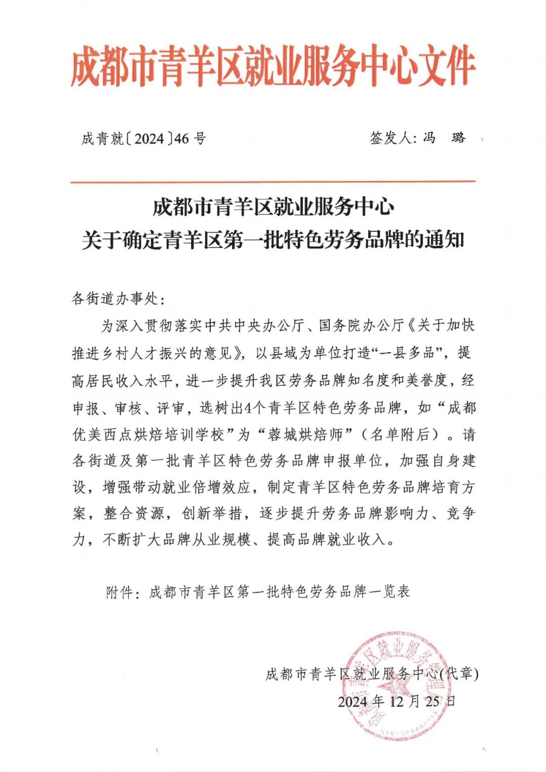 2024年12月25日,我校荣获了由成都市青羊区就业服务中心颁发的2024年青羊区特色劳务品牌“蓉城烘焙师”称号。