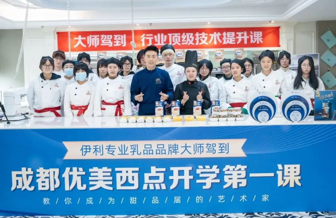 成都优美西点校长曾赛平、教务主管杨瑞,及教师团队共同出席。本次开学典礼特别邀请伊利专业乳品市场负责人、研发老师出席,并为同学们带来顶级烘焙技术提升第一课!